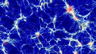 On the largest scales, matter in the Universe is arranged in a cosmic web consisting of filaments of gas separated by voids, with clusters where the filaments meet each other. From the MAGNETICUM simulation, courtesy of Klaus Dolag, Universitäts-Sternwarte München, Ludwig-Maximilians-Universität München, Germany