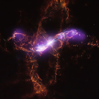 Images of R Aquarii have been captured using the Chandra X-ray Observatory’s X-ray data (depicted in purple) and the Hubble Space Telescope’s optical data (illustrated in red and blue).