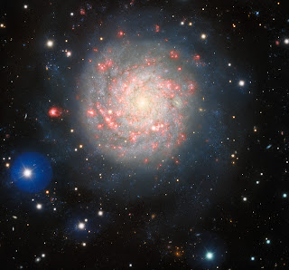 Despite its relatively small stature, NGC 1058 is a hotbed of stellar creation. The galaxy’s distance from Earth implies a modest size, yet it is distinguished by striking blue and pink regions, indicative of vibrant star formation.