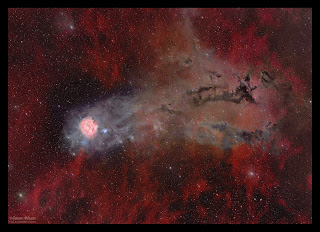 Extending from the Cocoon Nebula is a dark nebula known as Barnard 168—a trail of obscuring interstellar dust that snakes across the sky. This dark lane blocks the light from background stars, creating a striking contrast against the illuminated nebula and adding depth to the celestial scene.