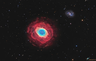 Image: Composite optical image of the Ring Nebula taken with small amateur telescopes. It was created using broadband filters (RGB) and a narrow band filter that focused on the emission of ionised hydrogen (Hα). The Ring Nebula and its outer structure are seen in detail. This image has a wide field of view, and on the top right, we can see IC 2196. Image Credit: Team Ouranos, Matthew Tequi, Mathieu Guinot, Jean-Baptiste Auroux, and Jean-Claude Mario @astrobin