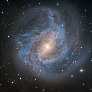 Image 1: Composite optical image of the Southern Pinwheel Galaxy. It was created using data from ESO’s TRAnsiting Planets and PlanetesImals Small Telescope–South telescope, using broadband filters in the B-band (blue and green), V-band (green and red), and the Red-band (red and green).