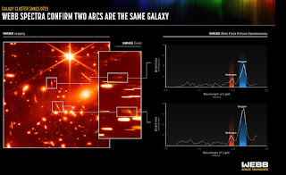 Next, the spectra from each of these two galaxies were plotted as graphs, shown at right, to reveal their compositions. The graphs, known as spectra, match, which indicates that these arcs are mirror images of the same galaxy. Webb’s spectra from NIRISS also quickly proved that light from both galaxies was emitted 9.3 billion years ago, further confirming they are one and the same.