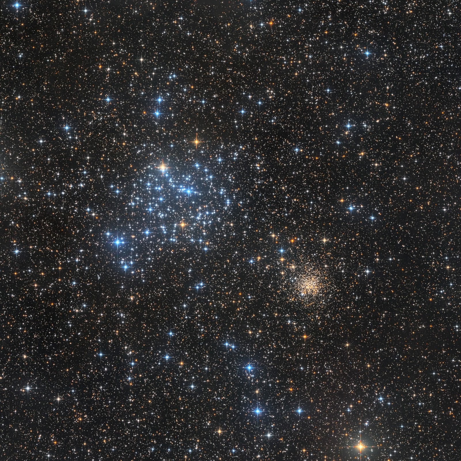 On the opposite side, NGC 2158 contains many more stars in a smaller volume. Furthermore, its stars are yellow in color as they are on average ten times older than those of M35. All these aspects (color and concentration) make NGC 2158 appear similar to a globular cluster, despite being classified as an open cluster.