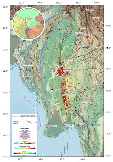 Figure: Map of the Myanmar earthquake mainshock and aftershocks (Thai network). Map also shows faults, colored by type, and contours of slip intensity estimated by the USGS.